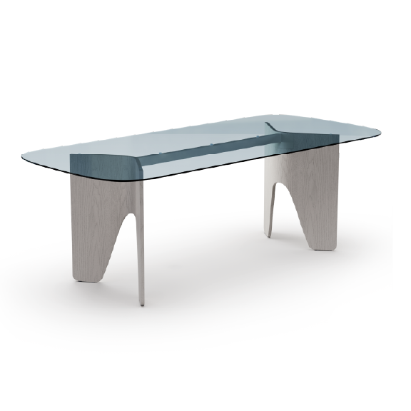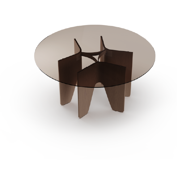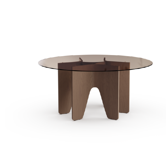 שולחן מבית המותג B&T, זמין במגוון גדלים וצורות (עגול או אובלי) המתאימים לשימושים שונים כמו חדרי ישיבות ומרחבי עבודה משותפים. בסיס השולחן, שעשוי מעץ בגוונים שונים, מתאפיין בעיצוב פיסולי וייחודי שהופך אותו לאובייקט מרכזי במרחב. המשטח זמין בגימורים משתנים בהתאמה אישית.
