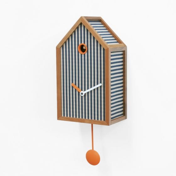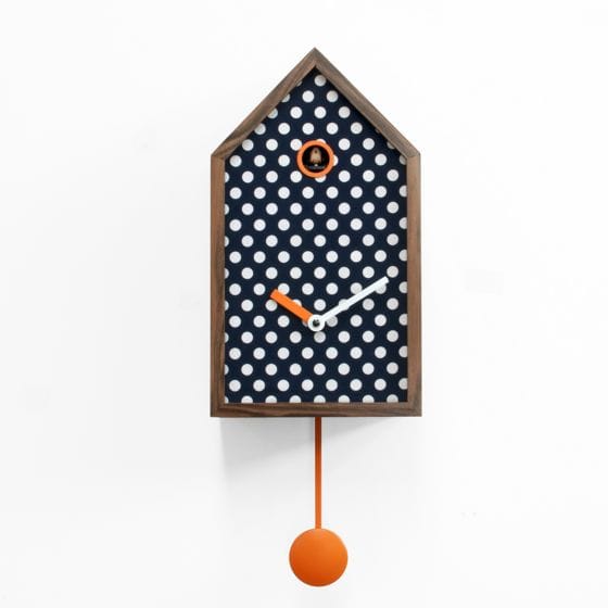 שעון קוקייה מבית המותג Progetti, מתאים לכל סביבת עבודה. לשעון צורה קלאסית עם דגש מינימליסטי. הפריט עשוי מעץ אגוז ובד בדוגמת פסים או נקודות. מיועד לתלייה על הקיר.