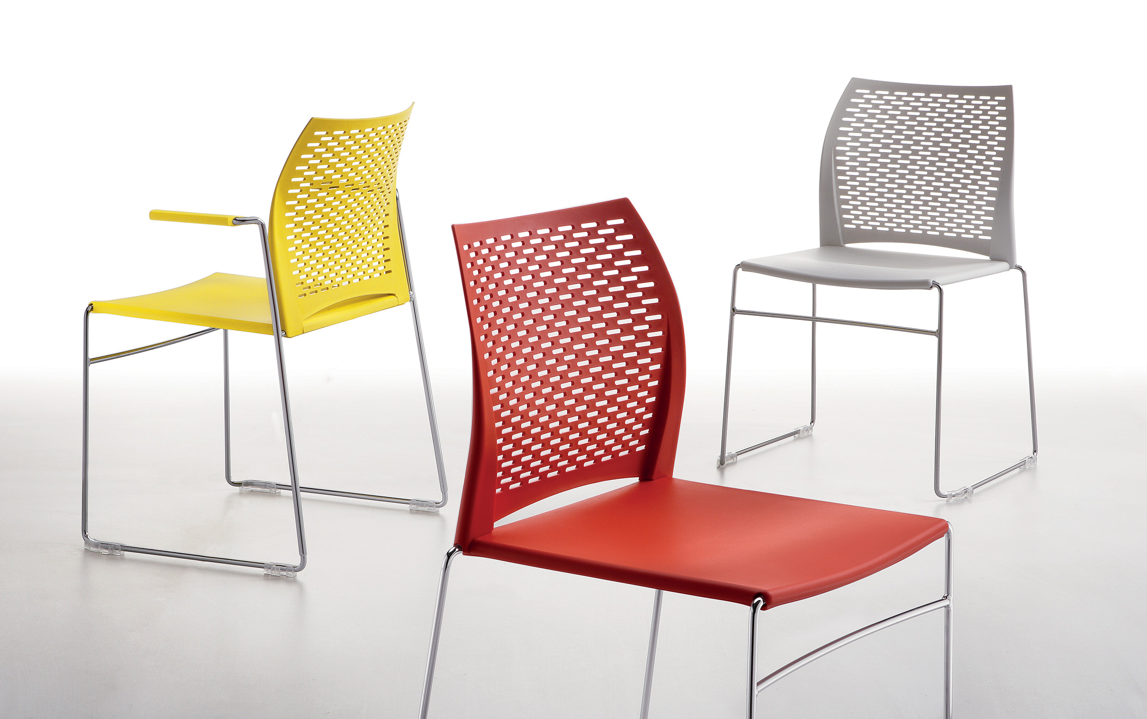 כיסא רב-תכליתי מבית המותג OMP, מתאים למרחבים משותפים וחדרי הרצאות. הכיסא עשוי מגימורים משתנים, כולל עץ בגוונים שונים ומושב פלסטיק עם משענת גב מרשת. זמין עם או בלי משענות יד, ניתן לערימה. הסדרה כוללת כיסא סטודנט.