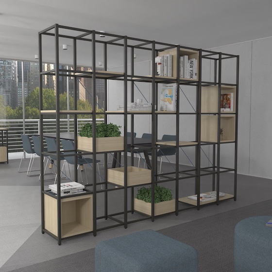 יחידת מדפים מודולרית מבית המותג Raio, מתאימה למרחבים משותפים וחדרי מנהלים. ליחידה מגוון מודולים ופתרונות אחסון בהתאמה אישית: מדפים, תאים פתוחים או סגורים ועוד. מבחר חומרים, גימורים וצבעים שניתן לשלב.
