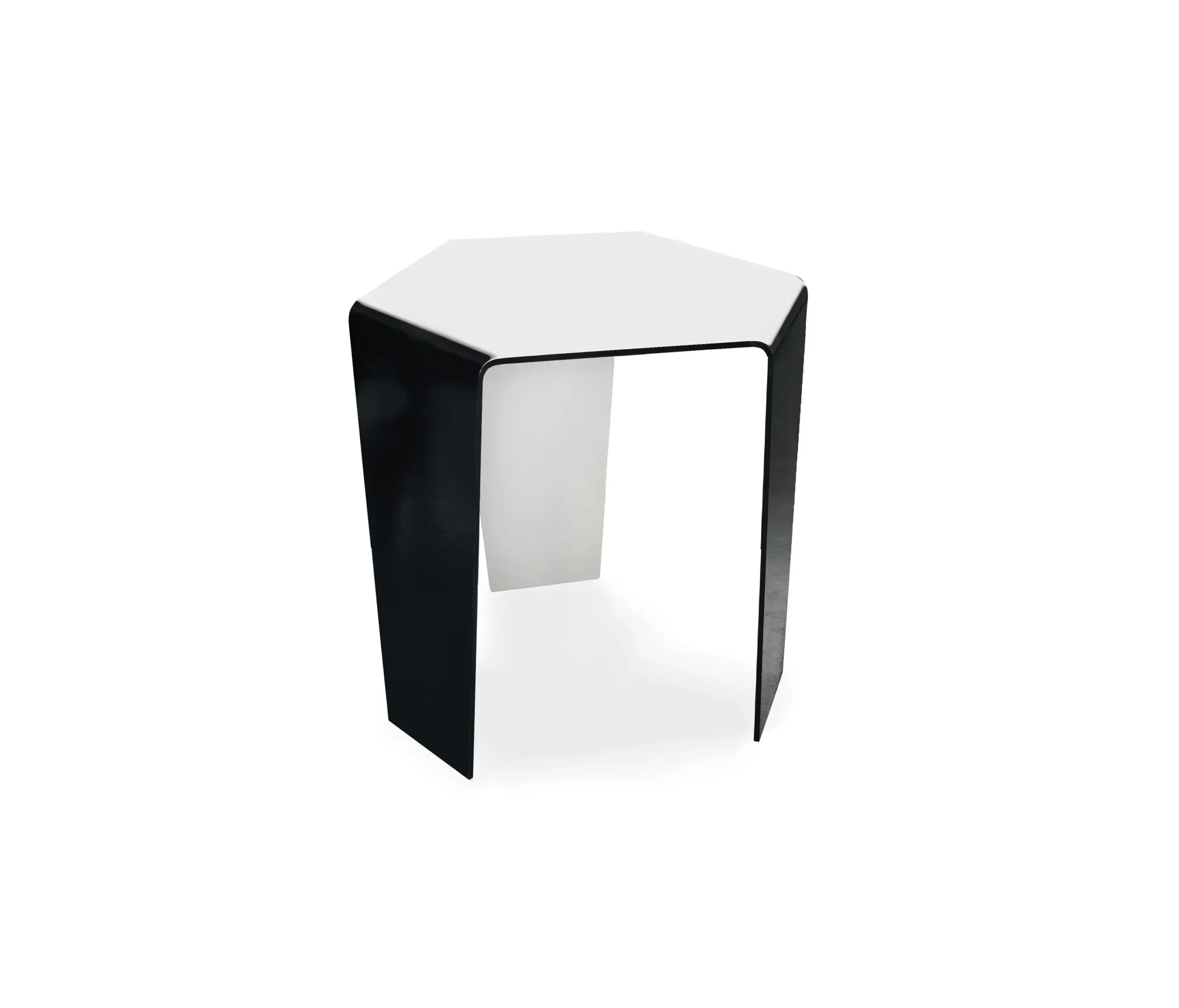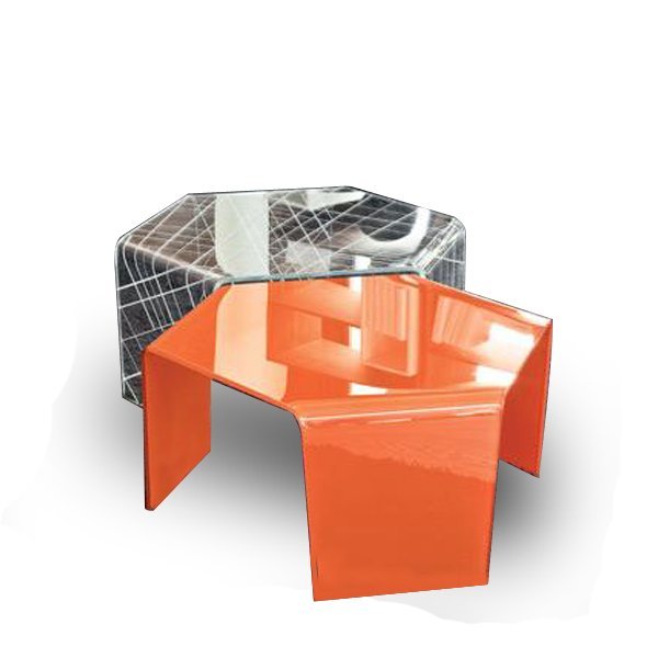 שולחן קפה בצורת משושה מבית המותג Sovet, מתאים לסביבות אירוח, אזורי לאונג' ולובאים. השולחן עשוי זכוכית מכופפת בדרגות שקיפות שונות ומגוון צבעים. זמין במספר גדלים שניתנים לשילוב זה לצד זה.