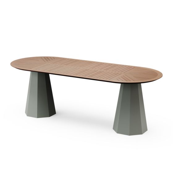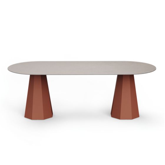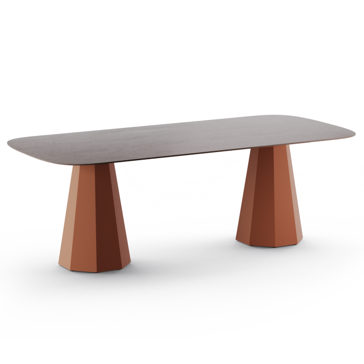 שולחן אוכל מבית המותג B&T, מתאים לאזורי הסעדה ולאזורים חיצוניים. לשולחן רגלי אלומיניום מסיביות בגוונים שונים ומשטח דק ומעוגל בגימורי קרמיקה או עץ אירוקו (עמיד לתנאים קשים). השולחן מגיע בצורות שונות וזמין במספר גדלים.