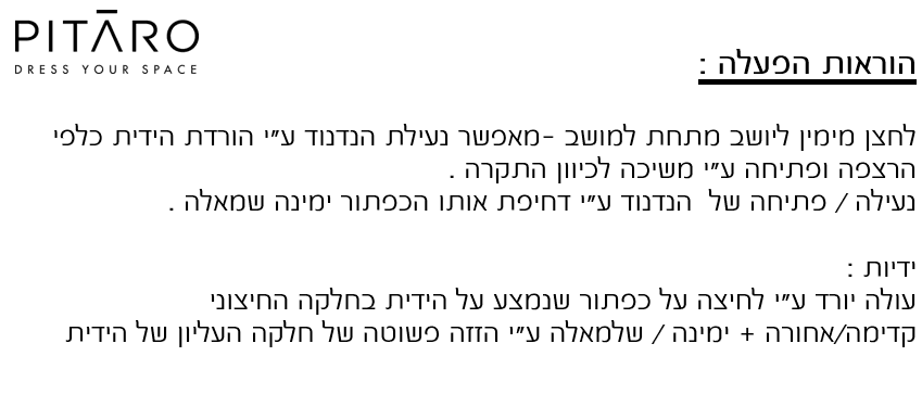כיסא עבודה ארגונומי מבית המותג פיטרו. לכיסא מנגנון נדנוד סינכרוני המפריד את תזוזת המושב והגב כך שיורד לחץ מהגב התחתון בעת הישענות לאחור; לחצן נעילת הנדנוד (גם בזווית) ואפשרות להתאים את גובה הישיבה; ידיות מתכווננות המאפשרות התאמה אישית מלאה; ומנגנון שקילה אוטומטית שמתאים את נדנוד הכיסא למשקל היושב.