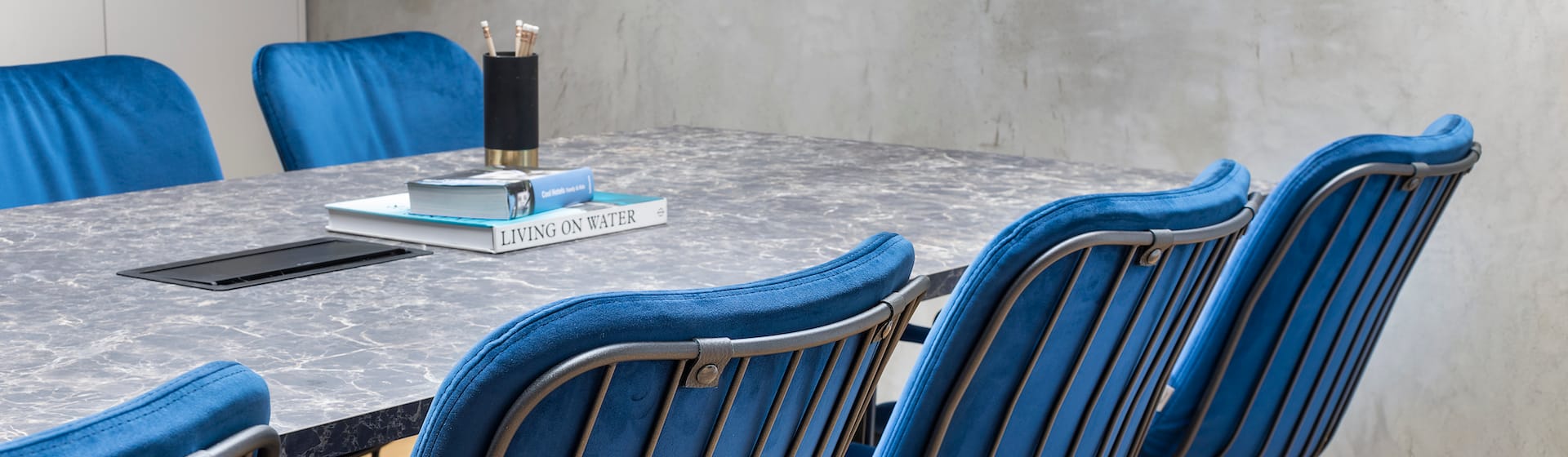 בפינות ההמתנה, כורסאות לאונג׳ מדגם Kata בריפוד העשוי חוטי פוליאסטר ממוחזר בגוון חול, בולטות על רקע פרקט עץ שחור דרמטי. בחדר הישיבות, שולחן אובלי עם משטח קרמי מלא נוכחות מדגם Deod, לצד כיסאות מרופדים מדגם Rego בריפוד בגוון אבן נקי.