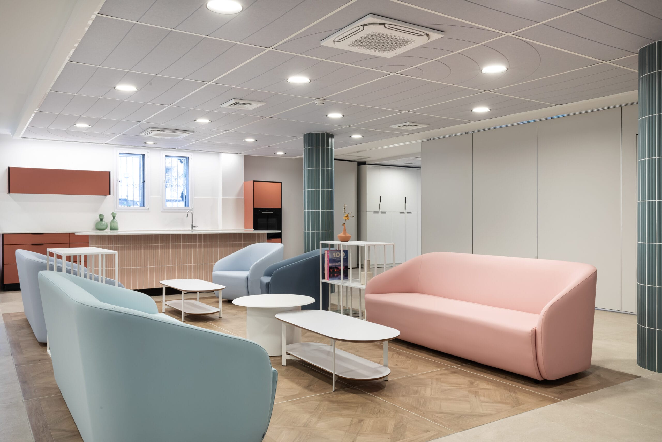 הטרקלין׳ – המרחב השיתופי החדש במכללת דוד ילין להכשרת מורים אשר תוכנן בהובלתה של מעצבת הפנים עידית אבו. ההחלטה האמיצה להפיח חיים באולם ההתעמלות המיתולוגי שחדל מפעילותו ולשנותו למרכז תרבות חי ופועם, נדרשה לרגישות גבוהה בתכנון כמרחב חדשני, תוך שמירה על השפה הארכיטקטונית הקיימת, המטען התרבותי שהיא נושאת ויצירת מקום של כבוד להתרחשות ההיסטורית הענפה של המקום. השפה העיצובית משלבת בין עבר והווה; סולמות וספסלי התעמלות היסטוריים משתלבים בעיצוב החלל, לצד פריטי ריהוט עדכניים, עתירי צבע כמו ספות מרופדות מדגם LED בגוון ירוק עמוק כסאות מדגם Daisy המרופדים בגוון קפה, שולחנות צד מדגם NOA מבית המותג B&T ועוד. בפרויקט ניתן לראות גם סדרת כיסאות אירוח המשתלבים בצורה מדויקת במרחב מדגם Noom 50 מבית המותג ACTIU מותגים מובילים אלו מיוצגים בבלעדיות אצלנו בפיטרו.